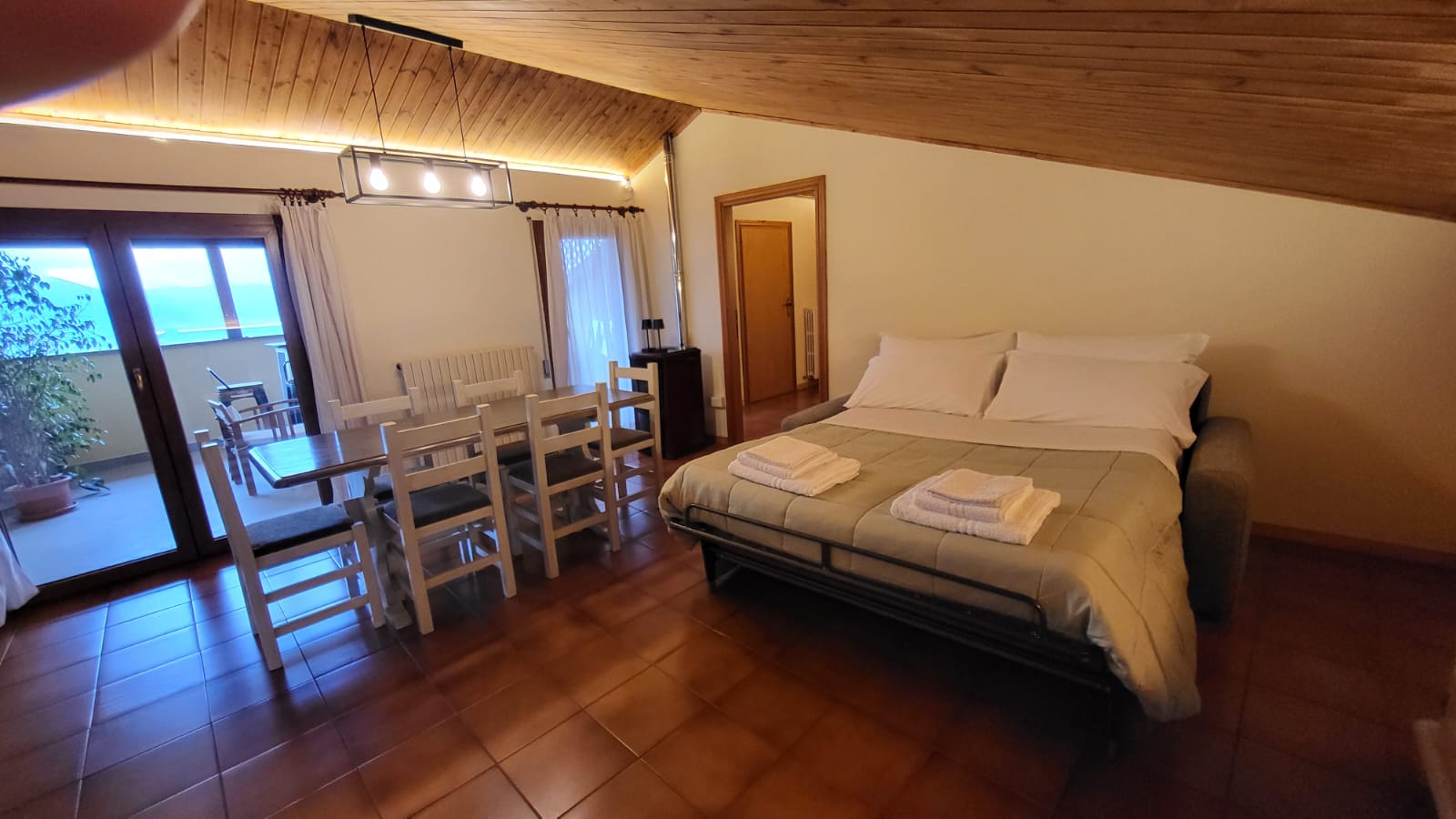 • Al primo piano, l'appartamento panoramico con due eleganti camere matrimoniali, un bagno, un disimpegno ed ampia loggia panoramica